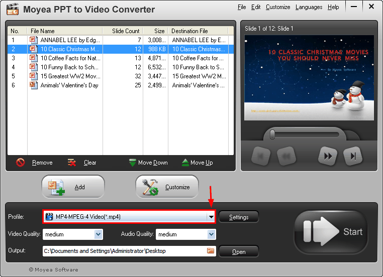 Your PPTX presentations can be converted to video files as well. PowerPoint 2010 enables you to save PPTX as video directly but only as WMV video and in the 3 default video sizes: 960 x 720, 640 x 480 and 320 x 240. Want to save PPTX as more video formats? Save PPTX to more video sizes for different screens? This time you need a tool to help you achieve your goal – Moyea PPTX to Video Converter.