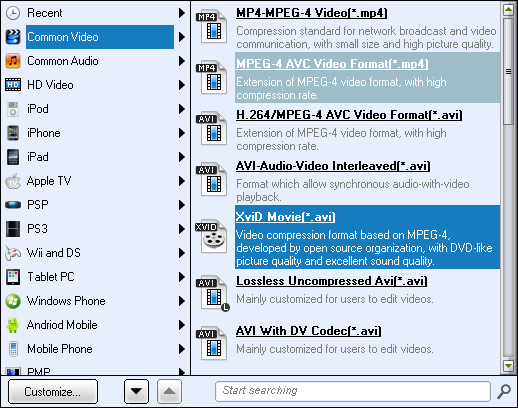 Click “profile” combo box to choose an output format. Here you can also choose Video Quality and Audio Quality.